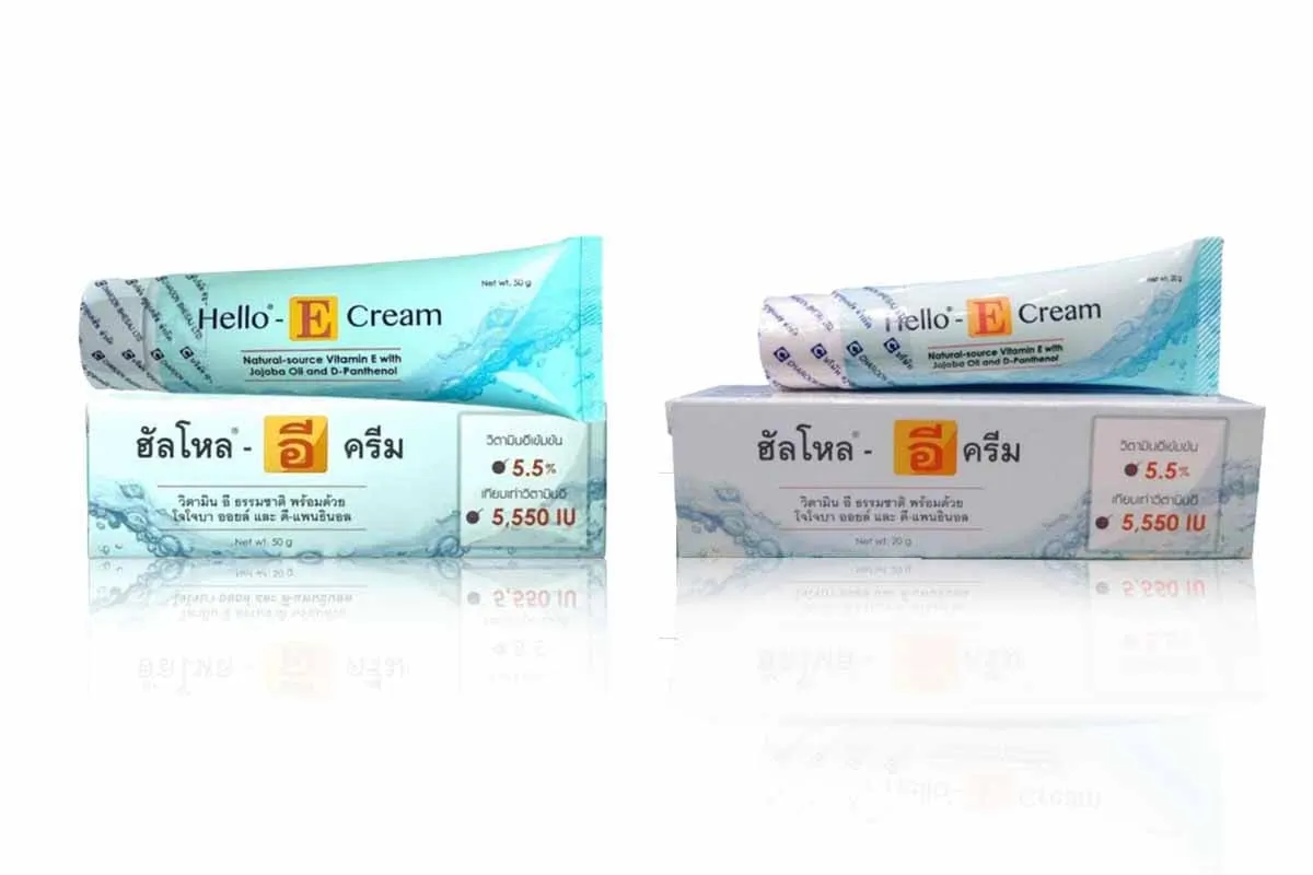 HELLO E natural vitamin E 5.5% equivalent to vitamin E 5,550 IU.It helps imporove skin reslilient, reduce wrinkles and restore deteriorated skin cells.HELLO E, Vitamin E Cream – 50 gHELLO E, Vitamin E Cream – 20 g